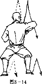 抬右脚向前半步,震脚落地, 体左转90°,左脚内收,两腿成马 步;同时,右拳变掌先向右穿击上 挑,变拳屈收护右肋外侧,拳 心向后,拳服斜向内;左臂屈肘左 拳护胸,拳心向内,拳眼向上。目 视右侧(图8 14)。