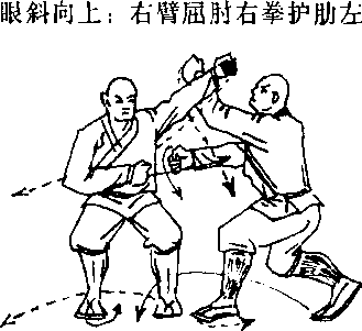 甲两腿变成右跪步; 同时两掌变拳,左拳上架 乙方左小臂,拳心向右, 拳眼斜向上;右拳直击乙 左肋下,拳心向左,拳眼 向上。目视乙左拳(图8— 67)。