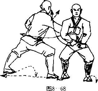 掌,右掌向前外拨乙左掌,掌心何左,掌栺斜向前;左臂屈 肘左掌护腰前侧,掌心向内,掌指向前。目视乙方(图8 — 69).