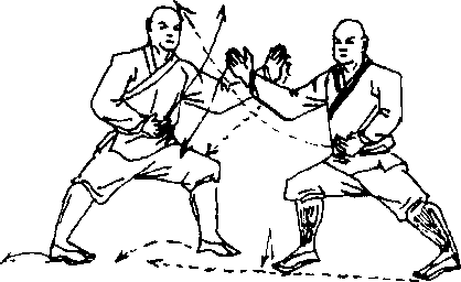 甲右脚前上一步,两 脚踞地,体左转9,两 腿成马步:同时,右拳向 下压挤乙方右拳,护于腰 间右前侧,拳眼斜向上;