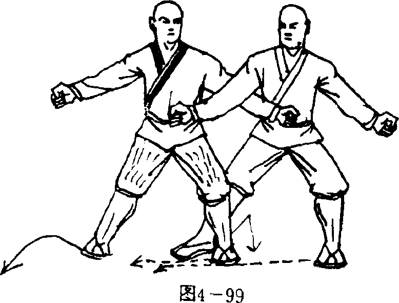 侧两腿成右弓步绊住甲左腿同时两掌抓住甲甲左腿同时两掌抓住甲方左手腕缠拧下拉于体方左手腕缠拧下拉于体前右侧,目视甲方。前右侧,目视甲方。乙左手被拿右臂屈乙左手被拿右臂屈肘右掌护于腰间前侧掌肘右掌护于腰间前侧掌心向左掌指向下。心向左掌指向下。目视目视乙方(图4—101)乙方(图4—101)