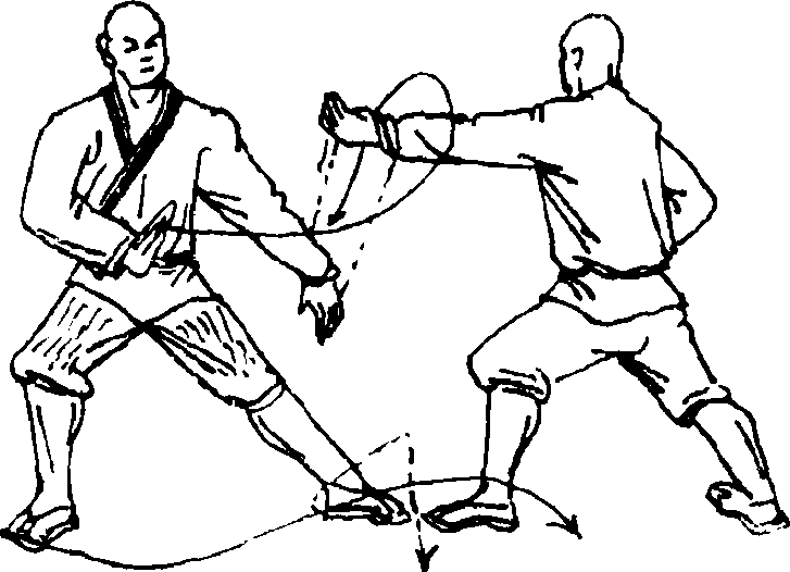 侧两腿成右弓步绊住一步落于乙方左腿后内