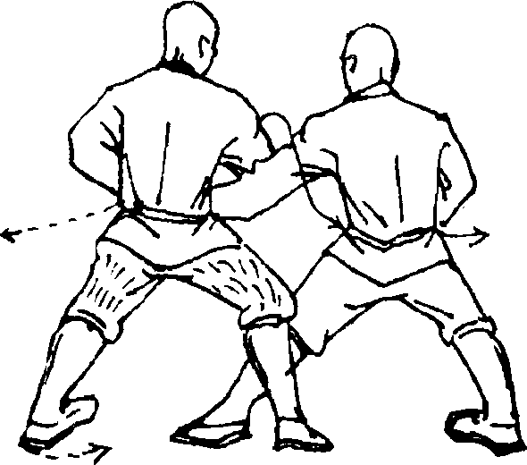 甲左脚抬起原地震脚下落体左转180。右脚向右横跨