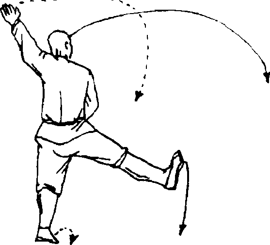 抬左脚前移震脚落地抬右脚向前勾踢同时右臂屈
