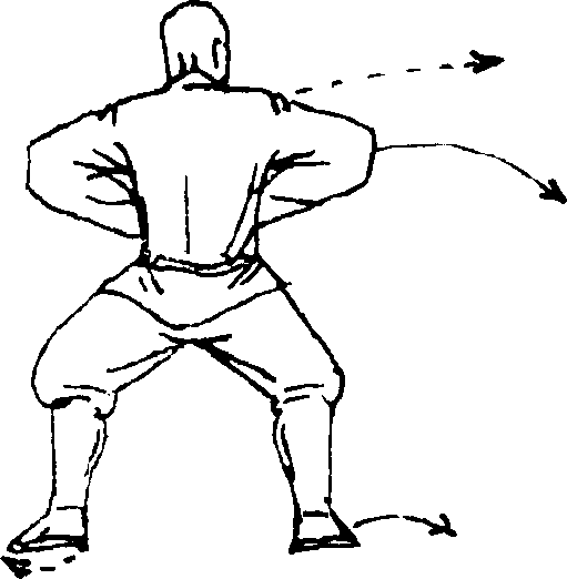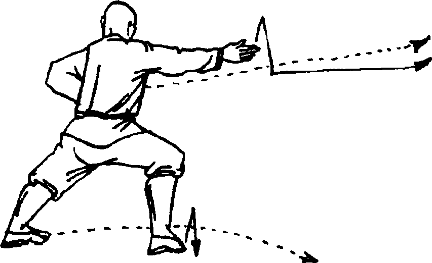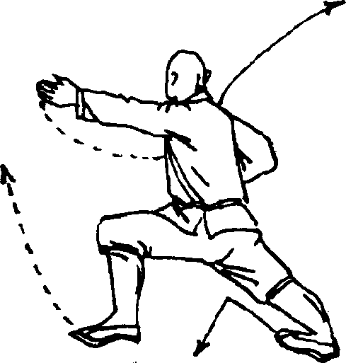 两脚为轴体右转90。抬右脚前上半步两腿成右弓