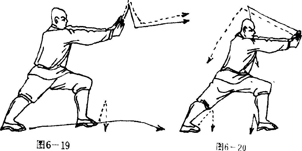 同时右手先上架再下压然后与左学共同向前推击掌心向前里指向上目视前方(图6—19)。