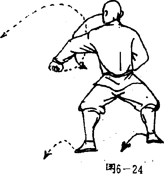 拳心向后拳眼向内拳心向后拳眼向内左臂屈肘左拳护腰间拳心向内拳左臂屈肘左拳护腰间拳心向内拳眼斜向上。目视右拳(图6—23)。眼斜向上。目视右拳(图6—23)。上动不停抬右脚原地震上动不停抬右脚原地震脚下落体右转180。左脚向脚下落体右转180。左脚向左侧横跨一步两腿成马步同时左拳随势向左侧挎击,左侧横跨一步两腿成马步同时左拳随势向左侧挎击,拳心斜向后拳眼斜向内右拳心斜向后拳眼斜向内右臂屈时右拳护于腰间前侧拳臂屈时右拳护于腰间前侧拳心向内拳眼向上目视左侧心向内拳眼向上目视左侧(06-24)。(06-24)。