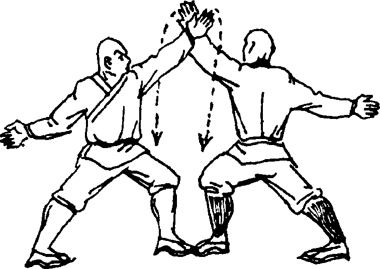 甲乙双方左弓步不变左掌向下拍击掌心斜向下掌