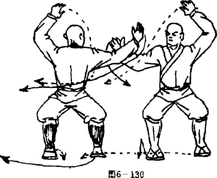 拳眼斜向上。以左肘尖顶击乙。目视对方(图6—131)