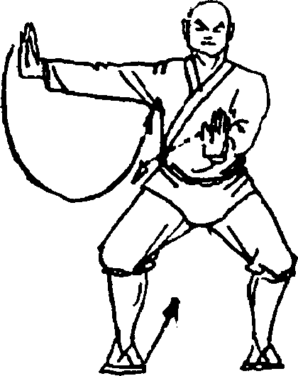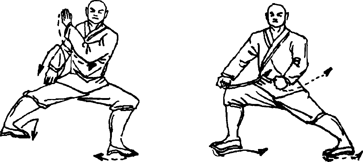 膝右腿蹬直两腿成左横弓步9同时右掌由上向下按压