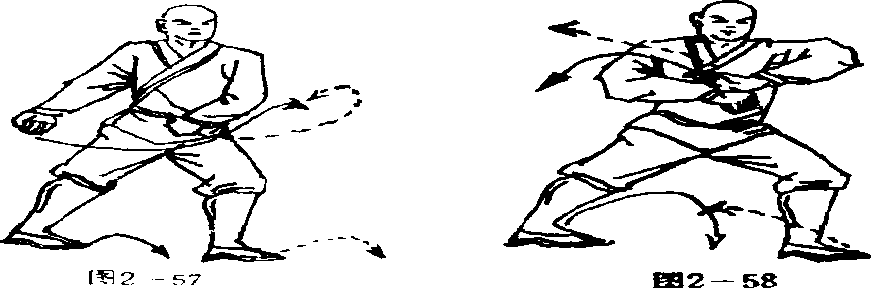 于体右下侧掌心斜向下掌指斜向前左臂屈肘左掌沿右掌背上滑然后护于右肩前上侧掌心向后掌指斜向上目视前方(图2—55)。