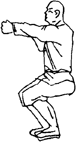 尖点地两腿屈膝半蹲(图1一6)尖点地两腿屈膝半蹲(图1一6)练法及用法平常多练习双腿半蹲收步提脚跟以半蹲势向前跳步后仍然落成半蹲势成虚步站立。注意身体重心始终放在脚掌踏实的一条腿上。束身虚步左右交替练习纯熟后再练习拳和掌的劈、打、推、击、挑、砍、勾、挂、撩等其它动作和收势。虚步主要用于敌强我弱的情况下使用闪避腾挪之法以防受敌重击有利于攻防进