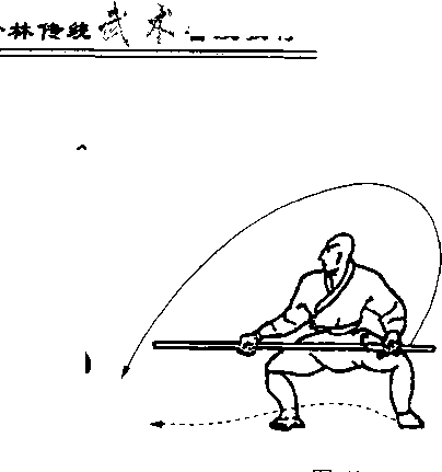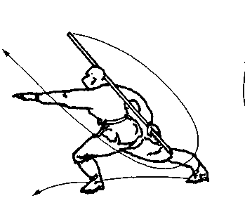 起身,两腿成左弓步,同时两手反把握棍向前 举,左臂上举,右臂下沉推棍斜格,上体微向前