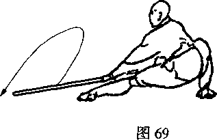 两脚碾地,体右转90度,左脚前上一步,两 腿成左仆步,同时两手握棍向前劈打,目视棍端 (图 69 )。
