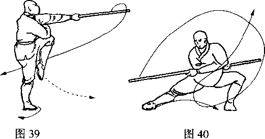 右脚向后落一步,两脚碾地,体左转90度, 两腿成插步,由右向左绞棍,然后滑把持棍由右向 左侧上方闪打,目视左侧(图38);动作不停,左 脚向左移一步,两脚碾地,体左转90度,半舞花, 然后使棍由右向左闪撩,同时左腿提膝,目视棍梢 (图 39 )o