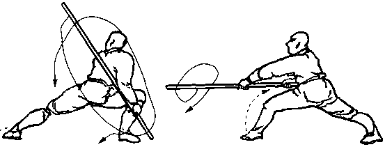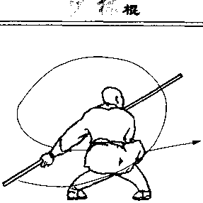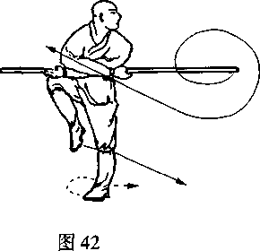 起身,两膝碾地,体右转180度,右腿向右提 膝,同时滑把,棍由左向右绕头缠旋,然后滑把由 右向左横穿,棍梢向后,目视左侧(图42)。