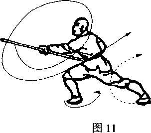 左脚下落右脚前一步,两腿成左弓步。同时两 手倒把,抡舞花,然后握棍由上向下平压。目视棍 根(图10)。随即右脚前上一步,两腿成右弓步。 同时抡顺花,然后两手握棍由右向左压棍。目视棍 根(图11)。