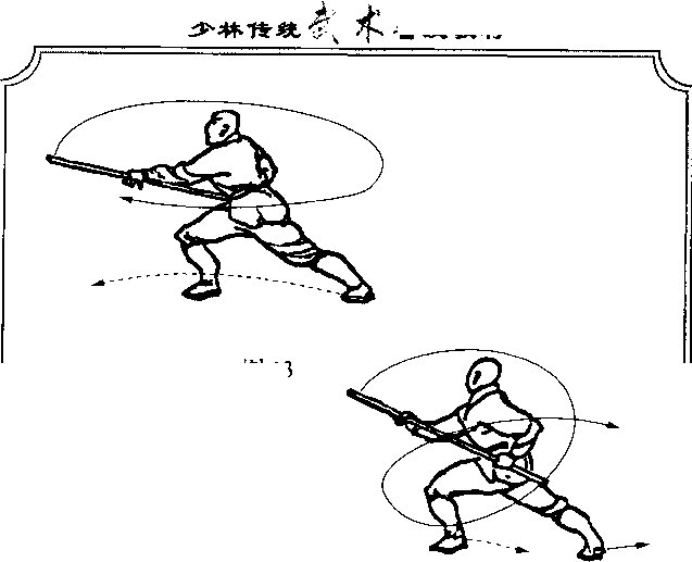 左脚向左落一步,两脚碾地,体右转180度, 两腿成右弓步。同时两手倒把,抡舞花,然后握棍 向前由右向左扫打。目视棍梢(图13 )。
