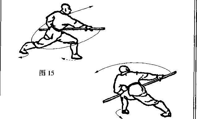 左脚前上一步,成左弓步。同时两手握棍,由 前向后抡打,然后两手握棍向前平刺。目视棍梢 (图 14)。