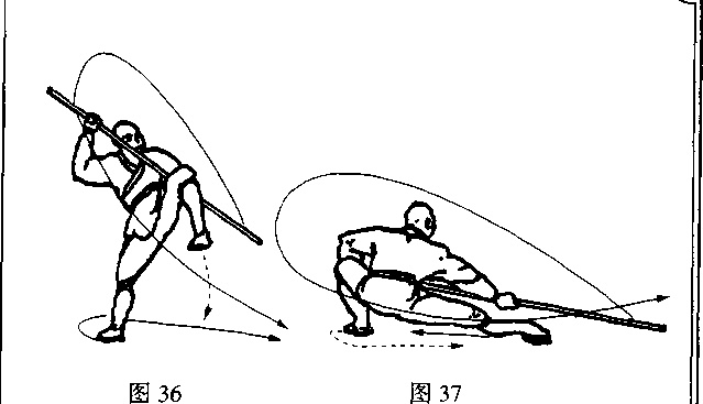 起身,右脚前上一步,左腿提膝,上体稍向后 仰。左手接把,两手握棍前后抡打,然后托棍举右 臂向左摆棍。目视左侧(图36)。