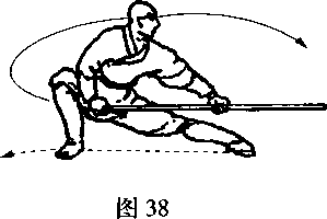 起身,两脚跳步向左翻转180度,落地后两腿 成左仆步。同时右手握棍随身绕头云旋,然后左手 接棍由右向左横扫。目视左侧(图38 )。