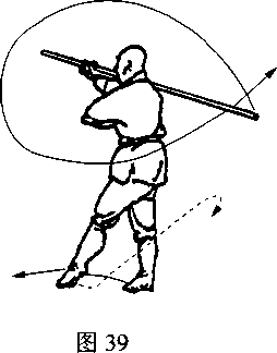 起身,两脚碾地,体右转90度,变为左虚步。 同时两手握棍抡半舞花,然后举臂,将棍体放于右 肩,棍梢向后。目视前方(图39)。随即右脚向前