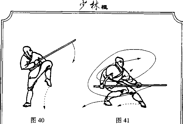 上一步,两脚碾地,体左转90度,左腿提膝°同 时两手握棍,抡半舞花,然后左手松把,右手握棍 绕头向上侧前方戳。目视棍梢(图40)。
