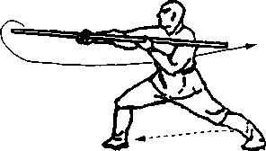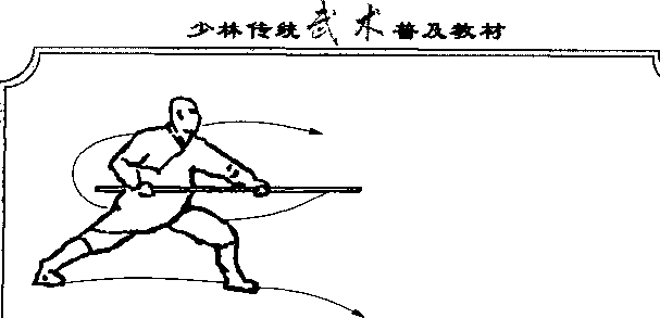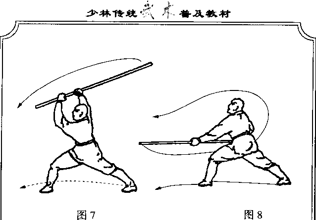 右脚前上步成右弓步,棍梢向上向后抡,一溜 向前挑阴(图7 )。