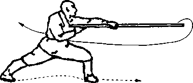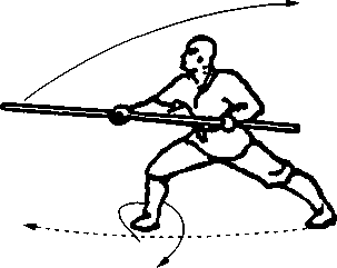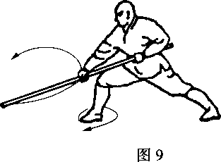 上右脚成右弓步,棍由右向左抡一圈,横打 (棍绕前头而过)(图9)。