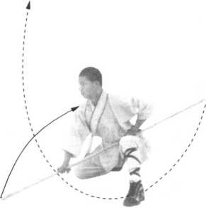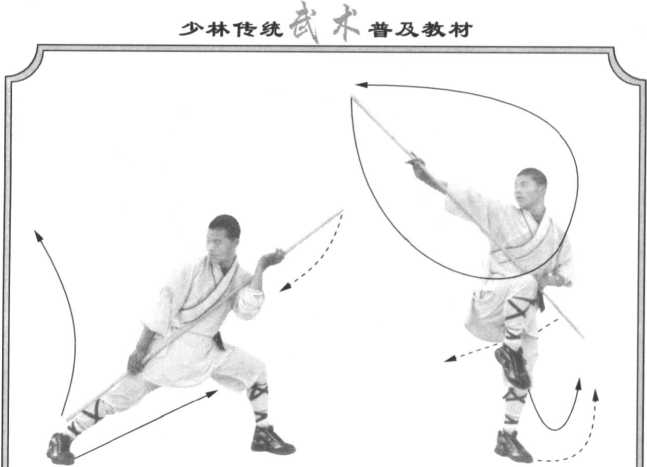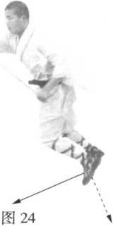 右脚下落于左脚外侧一步,体向左转90度, 抬右脚向前上一步,然后抬两脚向左翻身起跳,同 时两手握棍由下随身向上打(图24 )。