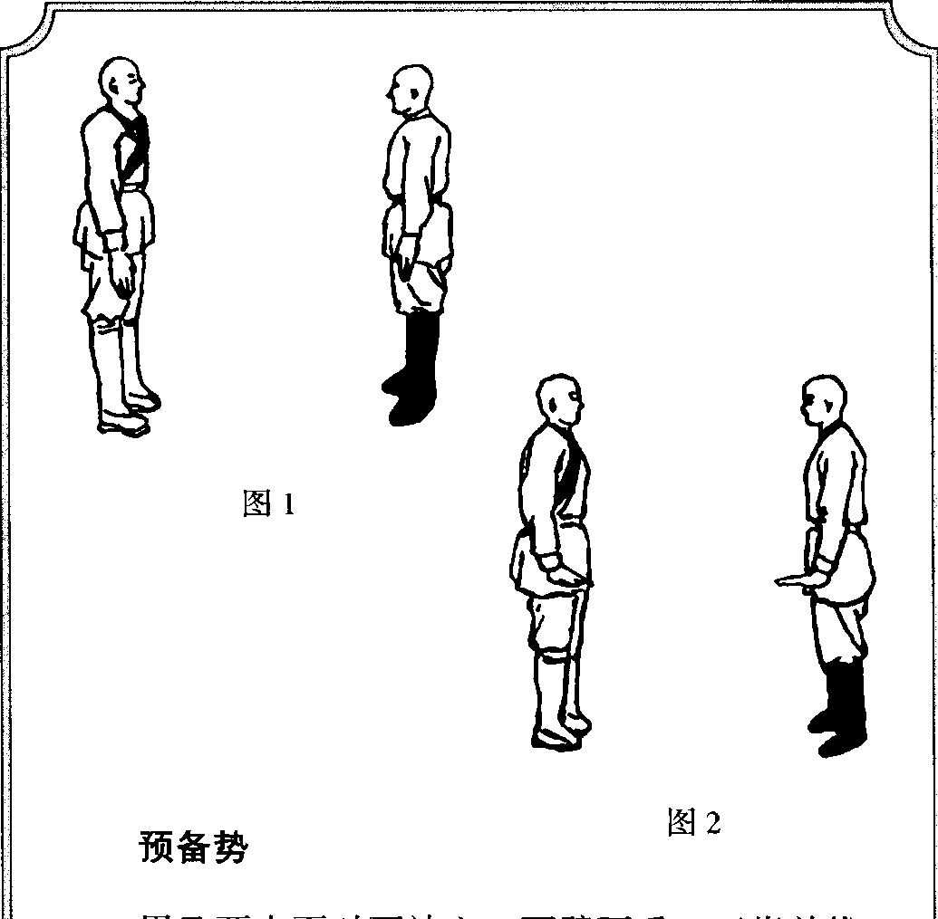 甲乙两人面对面站立,两臂下垂,五指并拢,甲乙两人面对面站立,两臂下垂,五指并拢,丨两手紧贴大腿外侧,手心向里,掌指向下。目视对 丨方(图1 )〇