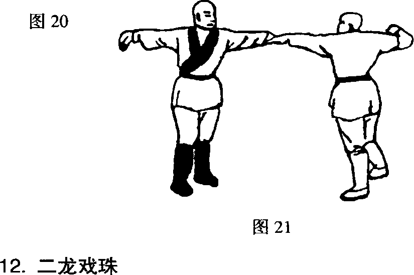 :,?甲乙同时甩开两手(图17)。甲乙同时出左手 j向前劈击对方(图18 )。再出右手对击(图19 )。丨又出左手劈击对方(见图18)。S ^:! 甲乙同出左脚,经右脚前向后移一步,使两腿成插步,收回左手与右手,同时由外向内划弧后屈 丨肘,使两掌在胸前成手脊相对的下勾手(图20)。甲乙右脚向左前移上一步,身向左转90度, 使两人面相对,两手向下分别划弧后再斜身侧展双 臂,高与肩平,两掌成下勾手。目视对方(图21)。JJ第二合进肘劈面掌JJ