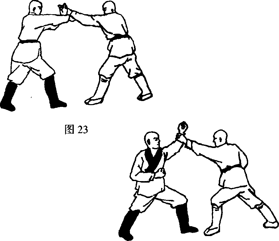 甲乙左脚向前上一步,成左弓步。同时右手由 内向前、向外再向内拦,然后左掌向前推出,互相 劈击对方面部,使两人对阵交手(图22 )。