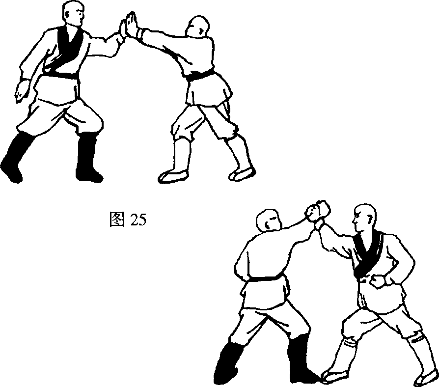 步,再上步成左弓步势,同时左掌击乙面部;乙随 即右脚向前上一步,以左掌挡之(图25 )。