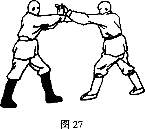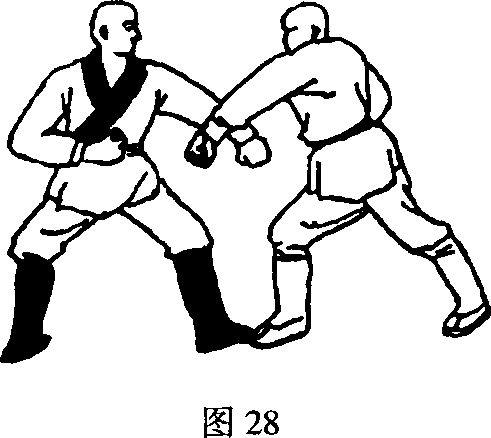 丨步,甲右脚向后退一步(图27)。乙右脚上为右弓 j步,同时出左拳击甲腹部;甲两脚碾地,体右转丨 |: 90度,两腿成马步,同时以左拳挡之(图28 )。