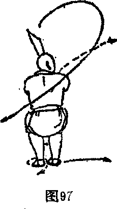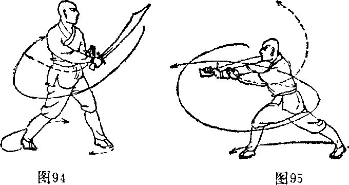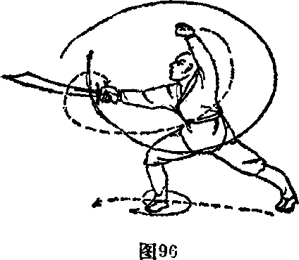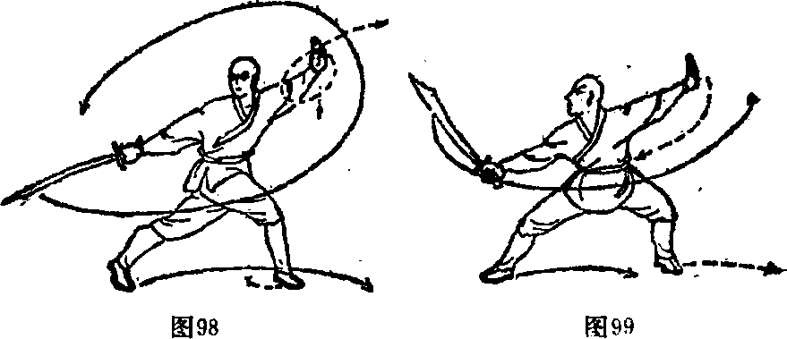 右脚向右跨一步,两脚碾地,体右转90°,两腿成右弓 涉,同时右刀向前上方砍刀,然后向右后方反刺,刀刃朝上, 刀尖向后,左手随身向前上方展臂亮掌,目视刀尖(图98)。