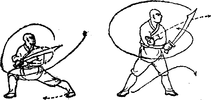 右脚向前上一步,两腿成右弓步,同时右刀由右后方向 前、向后,再返前抡一周,然后向前剌刀,刀刃向下,刀尖向