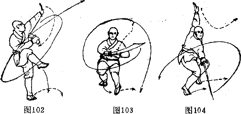 两脚向左侧跳一步,两腿下蹲,同时右刀由左上方向右 绕头抡一周,然后向右侧下方斩刀,左手向左侧上方撩臂亮 掌,目视刀尖(图104)。