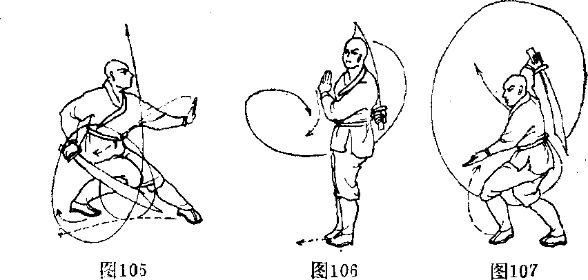 左脚向前上一步,提脚跟,成左虚步,同时右刀由后向 下向右抄刀,反腕举臂后刺,刀刃向后,刀尖向上,左手向 前下方用掌,目视前方(图107)。然后,抬左腿向右甩脚,