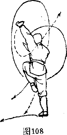 H时右刀由后向上绕头往削抢 劈,抖臂向右侧斜刺,左掌变拳, 举臂上冲,目视右侧(图108)。