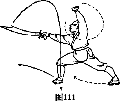 右脚向左脚前方上一步,两腿成右弓步,同时右刀由后 向前往右砍刀,然后向前直刺,刀刃向下,刀尖向前,左拳 由上向后再向前划弧,然后向上架于头上左侧,目视刀 尖(图111)〇