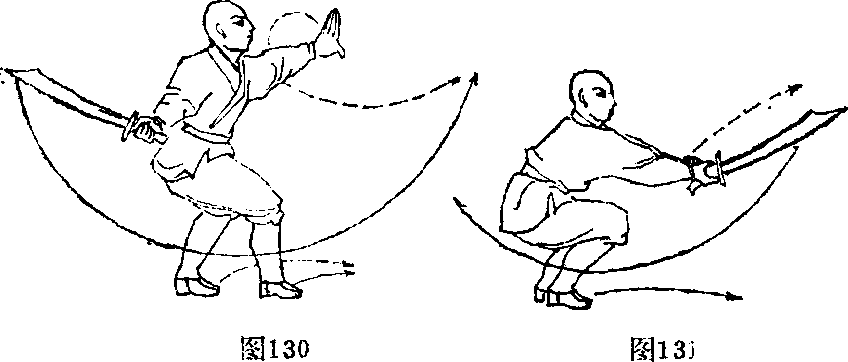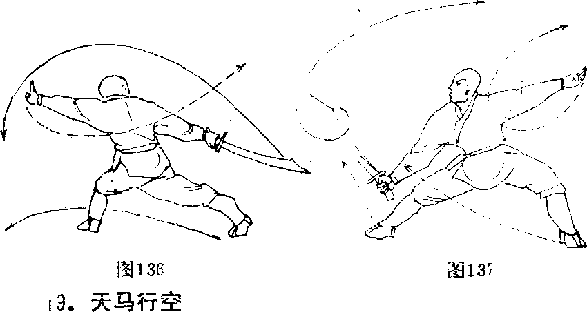 两脚向右侧前上方纵跳,当全身腾空时,右刀顺抡,然 后侧随全身腾跳向上举臂抓刀,刀刃朝上,刀尖向后,左手 握拳,向后展臂撩打,目视右侧(图138>。