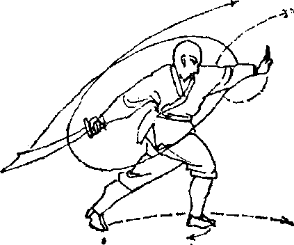 左抡一圈,然后由左向右后下方猛劈,刀刃向下,刀尖向 后,左手向前展臂推出,掌心向前,目视后方刀尖(图)3S)。 18,蝴蝶扑花