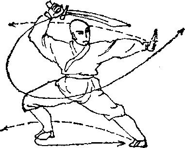 两脚碾地,体右转90,抬左脚向前上一步,右脚向前 上半步,同时右刀由左向右绕头抡劈,然后随身向后撩刀,