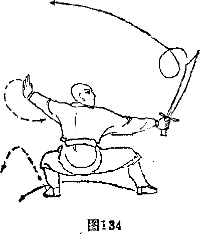 两脚同时起跳,向左翻转180°,转体后两腿成马步, 右刀由头上左侧向右随身向左翻身劈刀,刀刃向左,刀尖向 上,左手随身向左侧展臂杨掌,目视刀背(图134)。