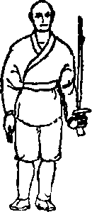 足立八字,身胸挺直,左手挺刀,刀刃向前,刀尖向上* 右掌护于右髋外侧,掌心向内,目视前方(图260>。