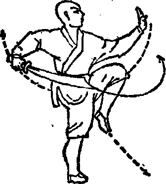 右脚向右侧稍移步为轴,左脚尖点地,体右转如°,右 手接刀撩于前方,刀刃向上,刀尖斜向下,目视前方(图261)。
