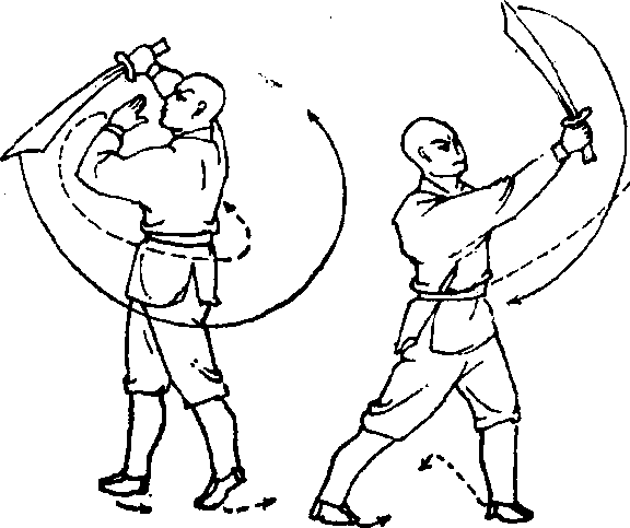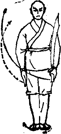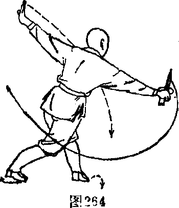 向后下方撩劈,刀刃向 后,刀尖向下,撩于身 后右侧,左手由后向前 按击,掌心向前,掌指 斜向上,目视前方(图 265) 〇