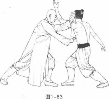 用法1敌方左脚前移步右脚向前跨步进身左拳击打我方面部。我方迅疾向后滑步避敌左拳锋芒之际左掌上起左掌背格敌左前臂外侧向外化开敌拳攻击力。(图1-61)2随即我方左脚前移步右手剑指向前戳击敌左腹侧商曲穴。(图1-62)图1-623 动作不停我方右手略收左手剑指点击敌右腹侧商曲穴。(图1-63)穴位商曲穴属足少阴肾经冲脉、足少阴之会别名高曲。位于脐中上2寸前正中线旁开05寸。在腹直肌内缘布有腹壁上下动、静脉有第8、9、10肋间神经分布。