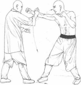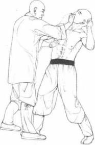 2 随即我方右掌按住敌右前臂下压左掌斜劈敌面部右侧(图2-11)